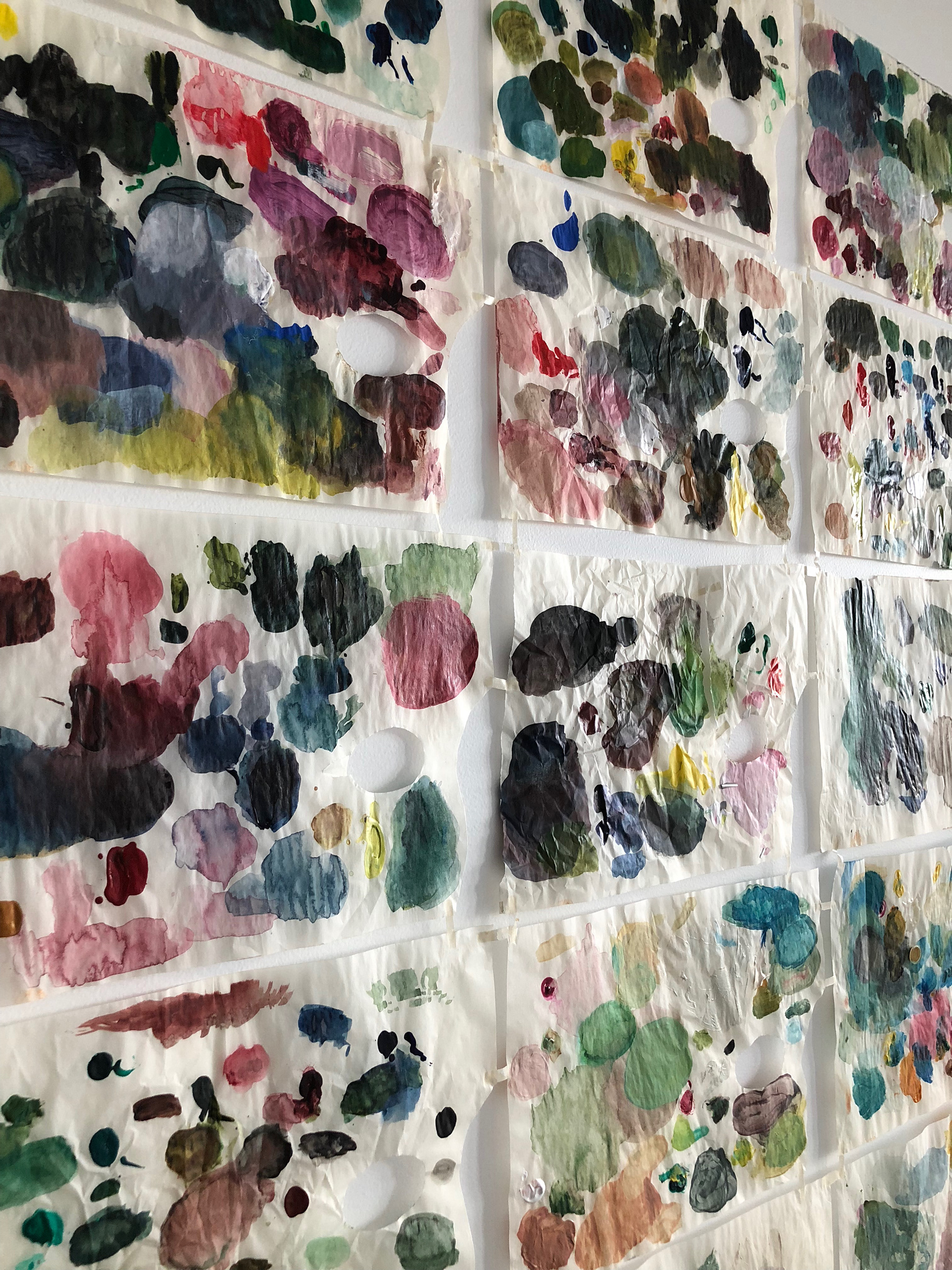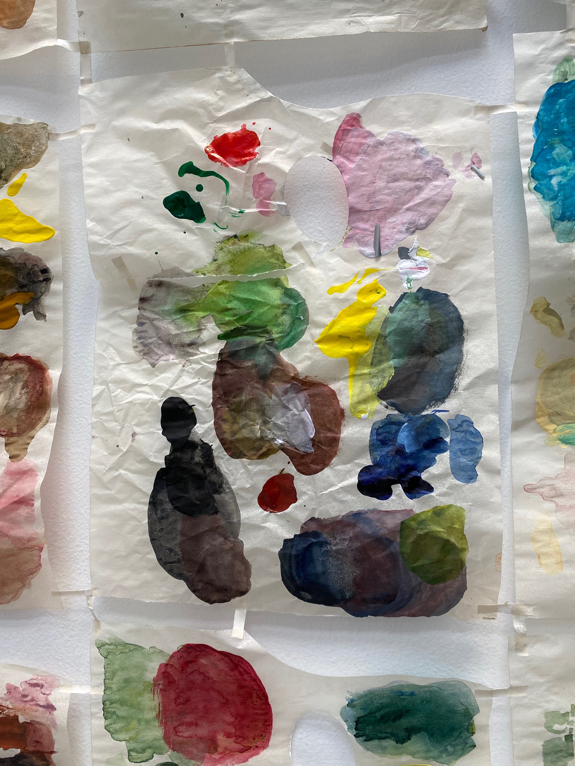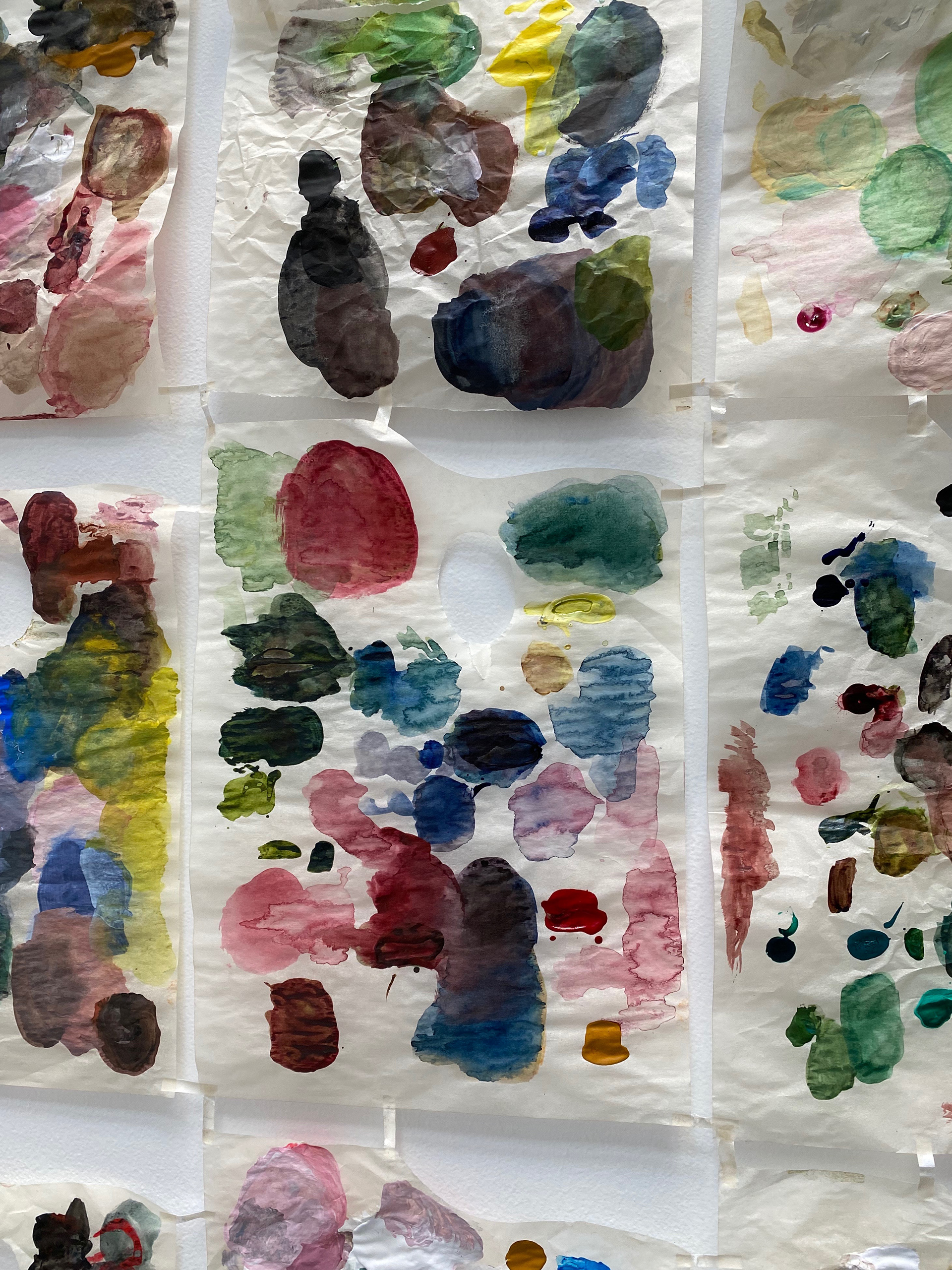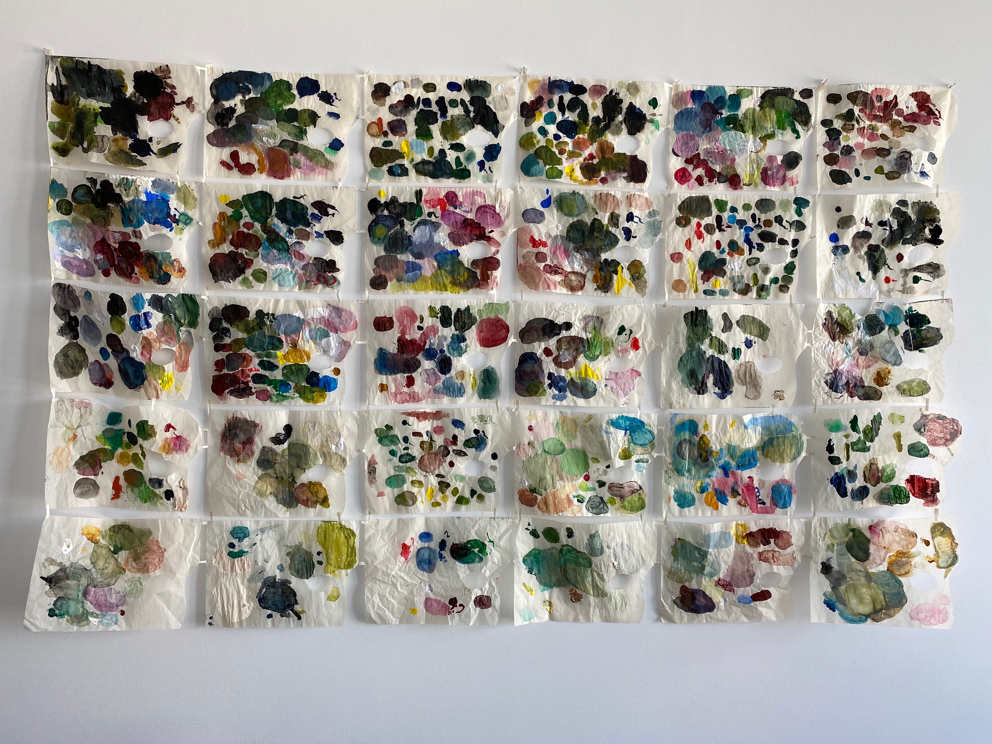 I made a grid from all my disposable palettes I've used recently. I like the conscious assemblage of the product of unconscious mark-making.